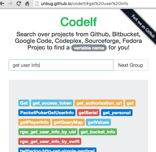 Codelf通過搜索在線開源平臺Github, Bitbucket, Google Code, Codeplex, Sourceforge, Fedora Projec的項(xiàng)目源碼,幫開發(fā)者從中找出已有的匹配關(guān)鍵字的變量名。這個搜索服務(wù)支持直接搜索中文。codeif支持中文查詢,輸入中文意思,codeif可以根據(jù)需要查詢盡可能滿足需要的結(jié)果,并展示與查詢結(jié)果相關(guān)的支持各種編程語言的代碼片段以及代碼庫。